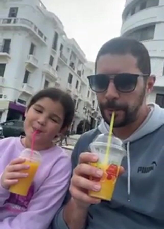 A close-up captures a man and a girl sitting outside, both drinking from clear plastic cups filled with a yellow liquid