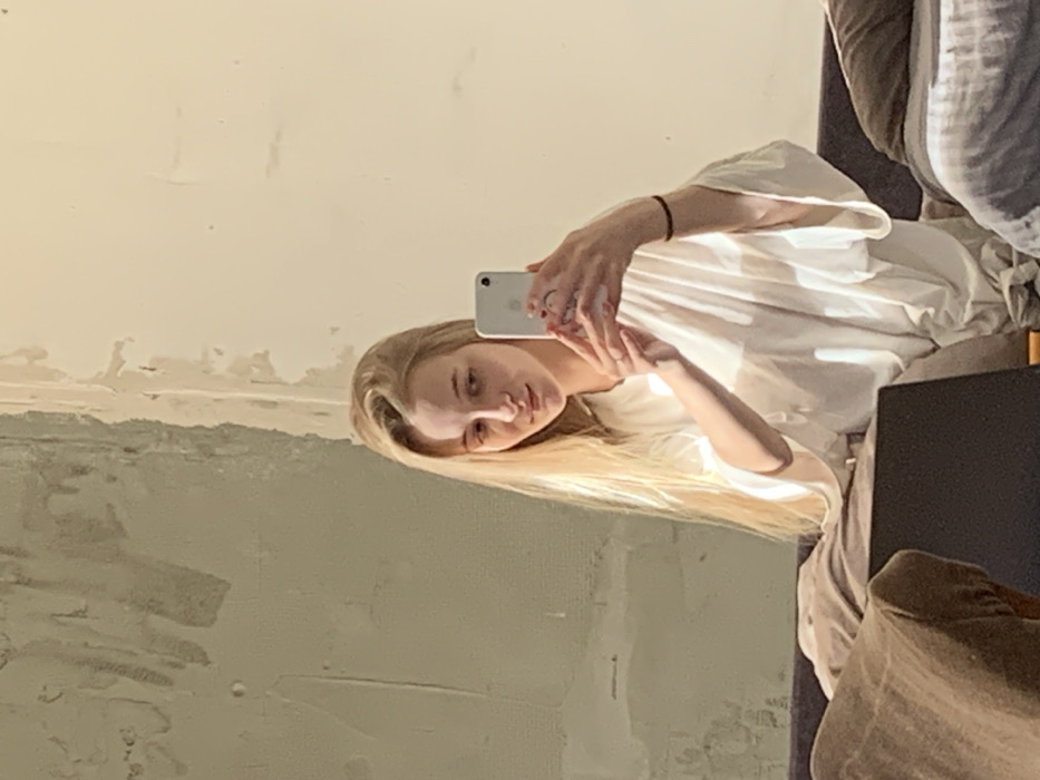 A young female, with long blonde hair and wearing a loose white top, is depicted taking a mirror selfie indoors in the city of Bohuslav, Ukraine