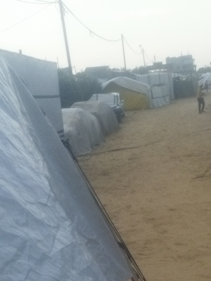 The scene, located in Khan Yunis, Palestinian Territory, depicts an outdoor area under a diffused, hazy sky