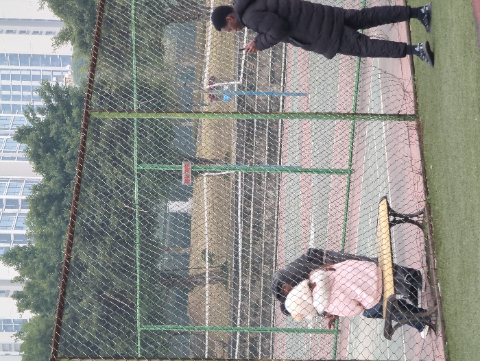 A tennis court scene behind a chain-link fence features two people. One person, wearing black, stands near the fence's edge, appearing to look at something in their hands. Another person, possibly seated, is visible with a pink shirt, with a bench seat beside them. The court is green, and several buildings and trees are in the background.