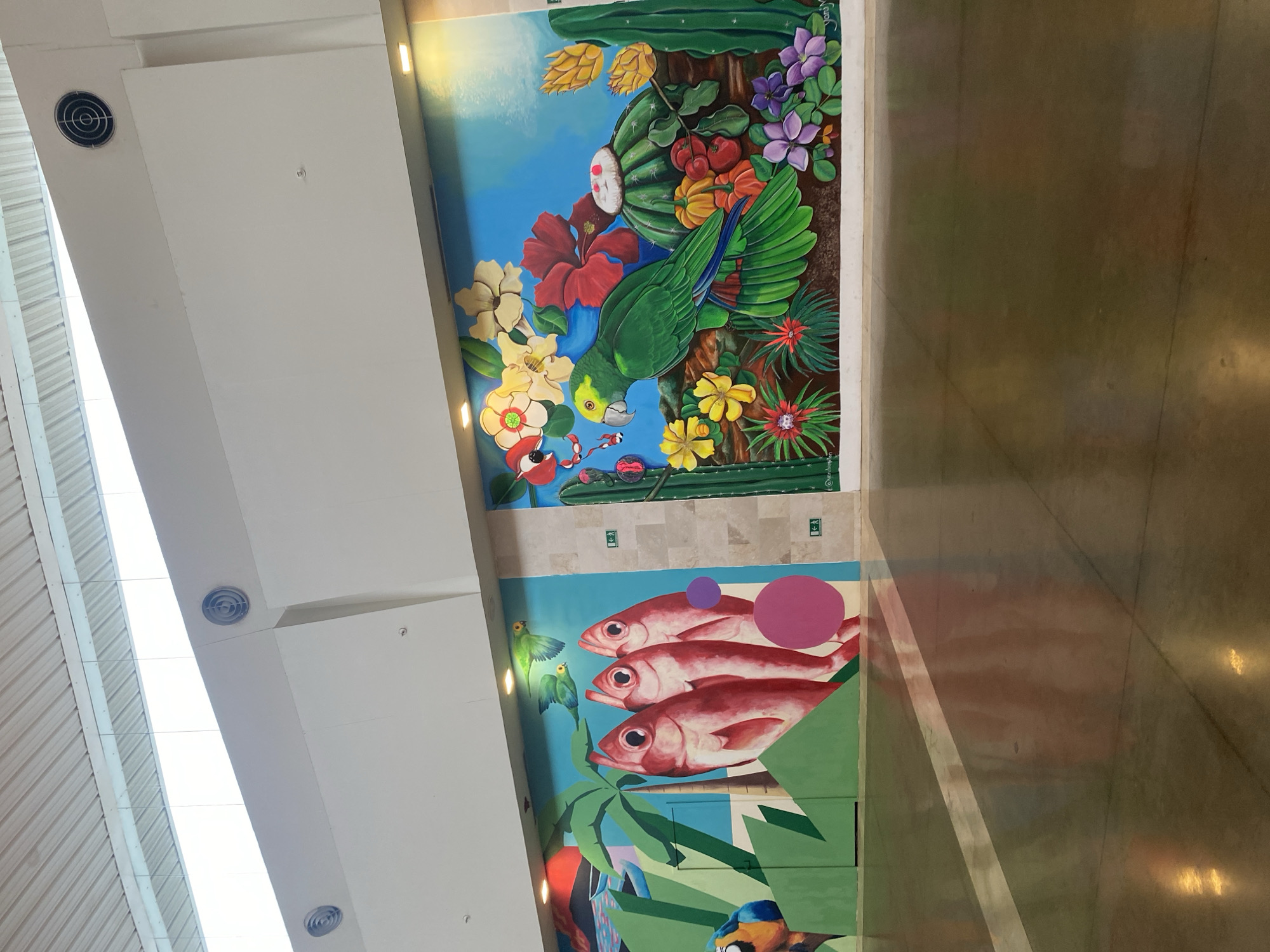The image depicts a vibrant mural inside what appears to be an airport or large building in Pampatar, Venezuela. The mural is divided into two sections: The upper portion features lush tropical flora and fauna, with a prominent green parrot surrounded by cacti and colorful flowers. The lower section showcases a school of red fish, with some abstract purple circles above them, along with tropical palm trees and other painted elements. The building's interior features a modern design with a white ceiling and visible ventilation fixtures. The floor appears to be polished and reflects light, creating a sense of spaciousness. No people are visible in the image.
