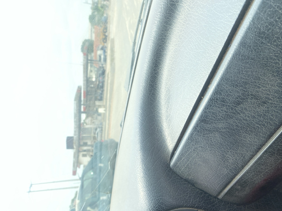 The image depicts an exterior scene in Owo, Nigeria, viewed from inside a vehicle. The foreground is occupied by a dark, textured dashboard, likely composed of plastic or vinyl, with a prominent seam running horizontally. Beyond the dashboard, a windshield offers a view of a gas station across a road. The gas station features multiple fuel pumps beneath long, flat canopies, distinguishable by their red and white coloring. A building, presumably the station's office or convenience store, is located beneath the canopies. Numerous vehicles, including passenger cars and at least one larger commercial vehicle or truck, are present within the gas station's perimeter and along the roadside. A dark-colored sedan or SUV is partially visible in the left midground. The sky above is bright and hazy, indicating daytime conditions. No specific individuals are clearly discernible. The windshield exhibits minor surface imperfections, possibly dust or fine scratches.