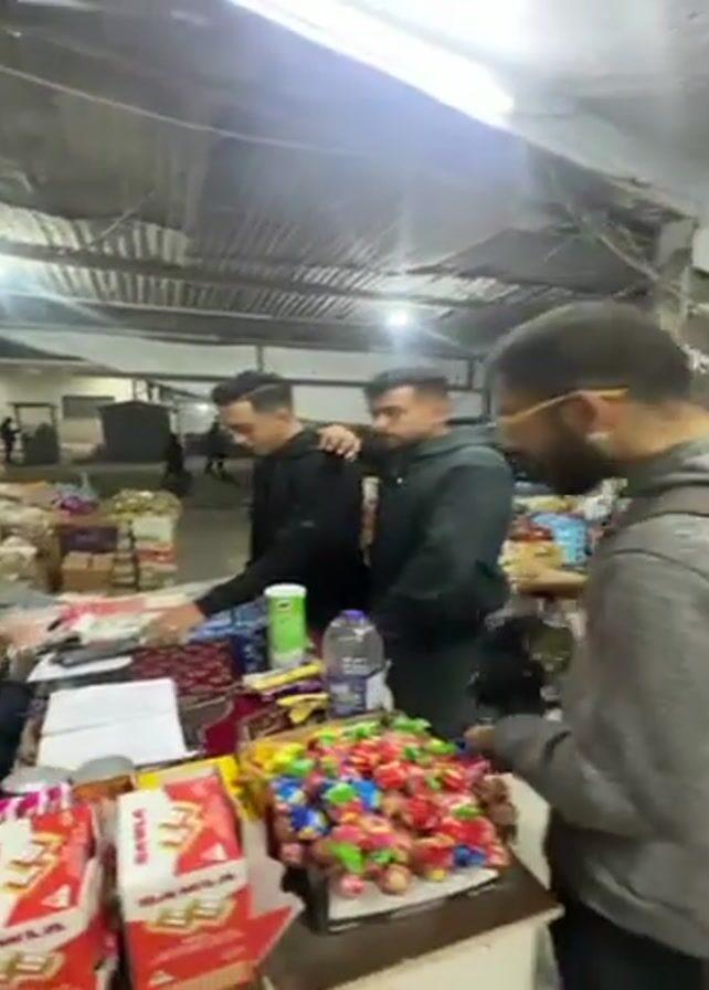 A group of four young men are hanging out in what appears to be a small convenience store. A person in a black hooded jacket is standing at the counter talking to the vendor. The vendor is sitting behind the counter which is packed with candy and other merchandise. Another person, wearing a black jacket, stands next to the person in the hooded jacket, while two other people stand to the right, next to the counter. The two people on the right smile and pose for the camera. One of the two persons on the right wears a gray hoodie and glasses. The environment is well lit, but the ceiling appears unfinished. The group appears to be in a cheerful mood.