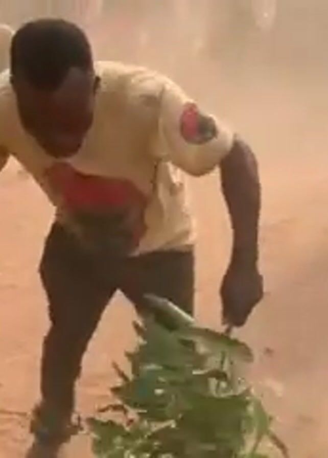 group of people on a dusty, dirt ground. A man in the center wears a light-colored shirt, dark pants, and something wrapped around his ankles. He holds a flat object in his right hand and a leafy branch in his left. Two other men are visible near him, also holding leafy branches. A cloud of dust obscures the background, where a crowd of people appears to be watching.