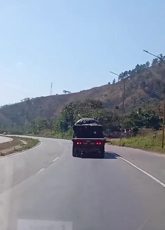 road trip along a highway with cars and trucks traveling in both directions. The camera is inside a car, looking through the windshield. The landscape includes hills and trees. A truck is driving ahead of the camera car, with a large, dark object on its flatbed. Street lights line the side of the road. The sky is blue with a few clouds.