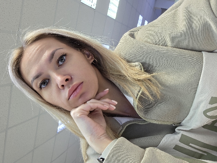 The image displays a head-and-torso shot of a fair-skinned female, estimated to be between 25 and 35 years old, with long blonde hair, light-colored eyes, and a neutral facial expression. She is looking directly at the camera. Her left hand, adorned with light pink manicured nails and a white-banded watch on the wrist, is positioned with her fingers supporting her chin. She wears a textured, light olive-green or beige quarter-zip pullover over a white top; the lower visible portion of the pullover is a lighter cream color with a partial dark graphic or text. Small, gold-colored hoop earrings are visible in her ears. The background is an indoor setting, consisting of a white acoustic tile ceiling with multiple embedded square or rectangular fluorescent light fixtures providing overhead illumination. The specific location within the city of Chaikovsky, Russia, cannot be determined from the visual evidence.
