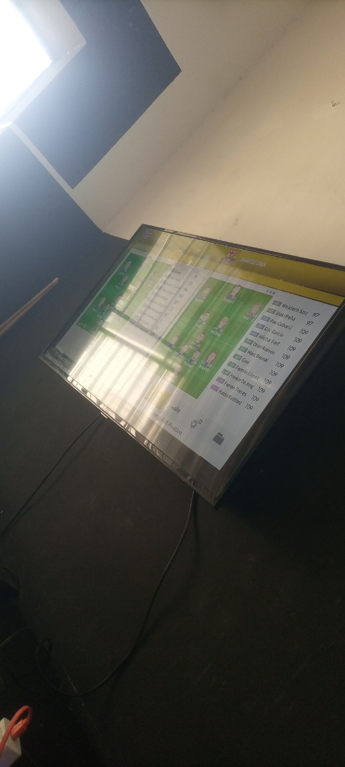 The image depicts an indoor setting in Jalingo, Nigeria, featuring a large, rectangular display screen positioned on a dark, flat surface. The screen, tilted upwards, exhibits significant glare from an overhead light source, reflecting a window or skylight in the upper left. The content on the screen is a graphical interface, likely from a football (soccer) management game or team roster display, showing "BARCELONA" at the top right, along with player names such as Wojciech Szc, Iñaki Peña, Eric García, Héctor Fort, Marc Bernal, Oriol Romeu, Gavi, Fermín López, Frenkie De Jong, Ferran Torres, and Marcus Rashford, each accompanied by a numerical value (e.g., 97, 109). Black cables are visible extending from beneath the screen across the dark surface, and a white power adapter with an orange-tipped plug is partially visible in the bottom left corner. In the upper background, the wall or ceiling features distinct geometric sections, with a light-colored (cream/off-white) area contrasting with a darker, possibly blue-grey, section. No individuals are present in the frame.