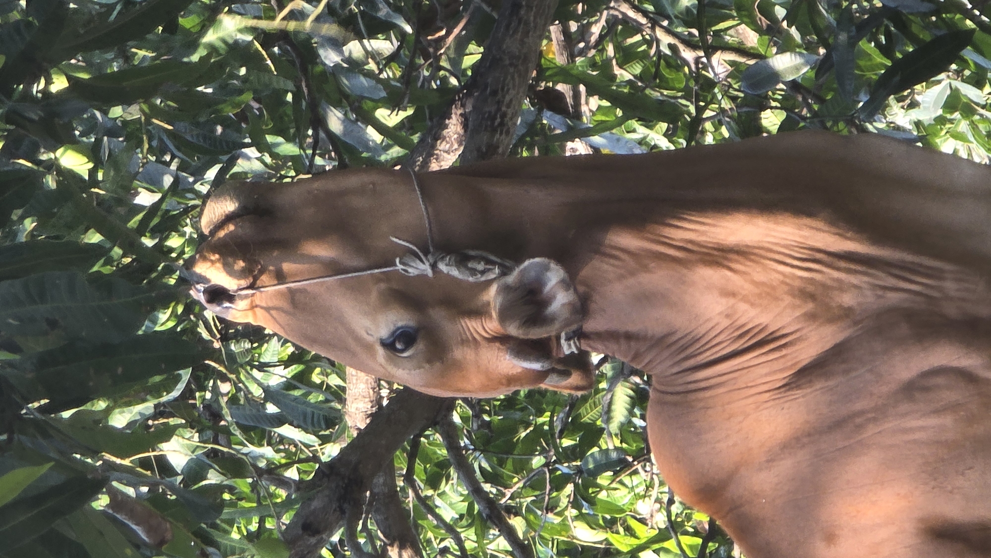 A reddish-brown cow is tethered to a tree with green leaves in Bac Natural Heritage Area Trang, Vietnam. The rope is tied around the cow's face.