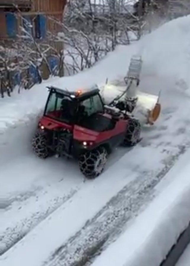 A red snowplow clears a snow-covered road in a mountainous area. The snowplow has snow chains on its tires, and the sides of the road are lined with snowbanks. A few houses are visible in the background, their roofs and surroundings covered in snow. The camera moves to show the snowplow operating.