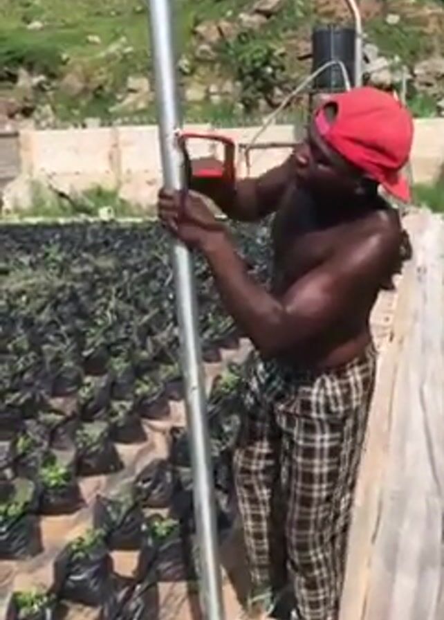 shirtless man in a red hat and plaid pants, sawing a metal pole with a small saw. The man is outdoors, near rows of black plastic bags containing small green plants. Behind him are a retaining wall and a hillside. The man is focused on sawing the metal pole.