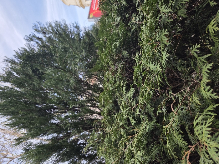 The image captures an outdoor scene dominated by evergreen vegetation in Gevgelija, North Macedonia. The foreground is occupied by a dense, dark green shrub or hedge, exhibiting numerous scale-like leaves and visible brown branches. Behind this shrubbery, taller, darker green coniferous trees are present, extending towards the upper portion of the frame. In the upper right background, a segment of a light-colored building with architectural detailing, possibly a curved facade or column, is visible. Adjacent to the building, a red rectangular sign or billboard featuring yellow text or graphics is partially discernible. The sky above is light blue with scattered white clouds, indicating daytime conditions. No individuals or animals are present.