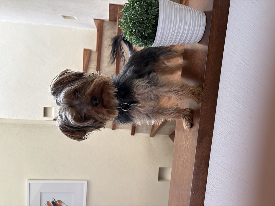 A brown and black Yorkshire Terrier stands on wooden stairs