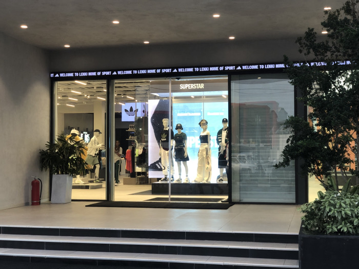 The image displays the exterior entrance of an Adidas retail store, identified by an LED ticker as 'WELCOME TO LEKKI HOME OF SPORT' and located in Ilado, Nigeria