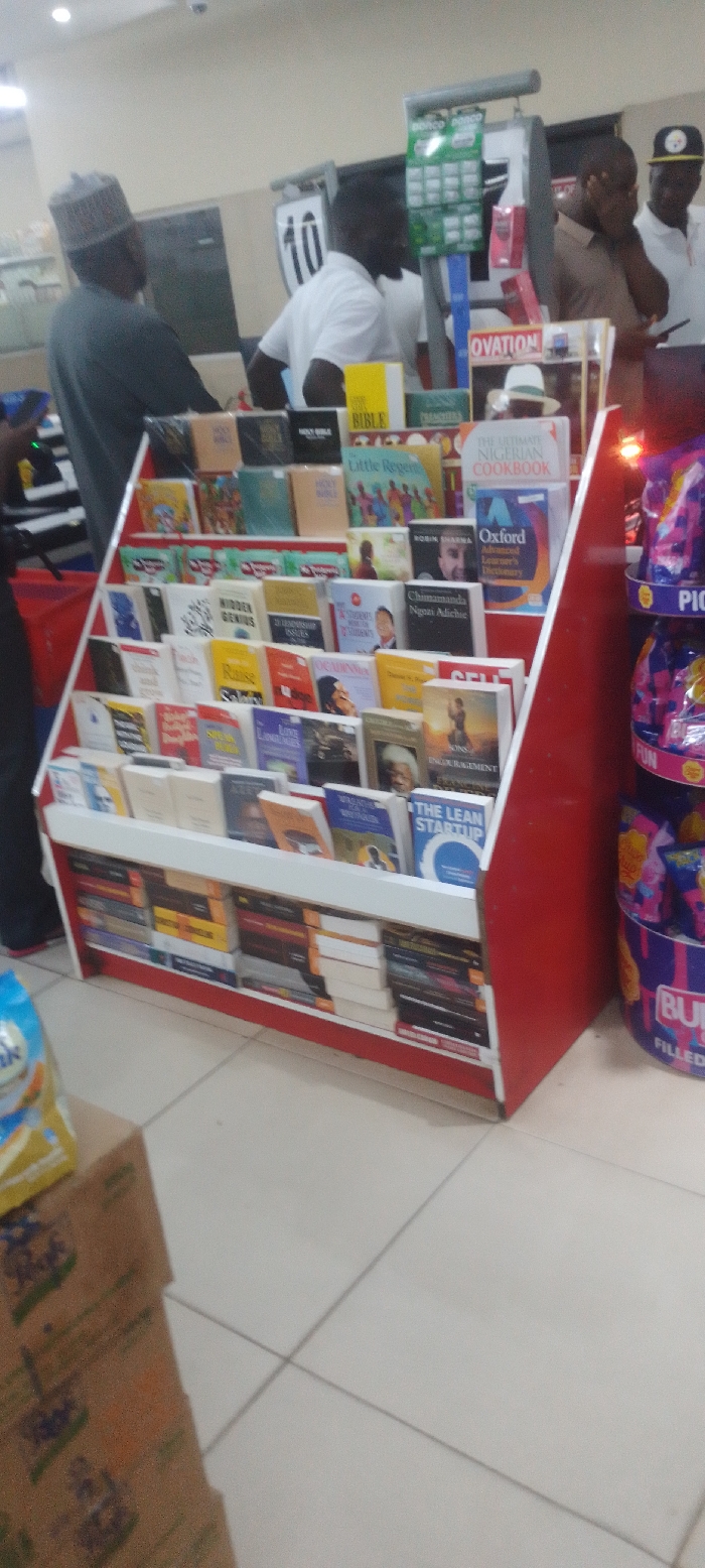 bookstore in New Karu, Nigeria, at the coordinates 8.991, 7.57. The scene is a bookstand with multiple rows of books arranged by category. The stand has a red base and white shelves. There are four people in the scene; one man stands near a cash register. The man is wearing a white shirt with a number 10 on it, and a white hat. Another man is wearing a white shirt with a green hat, and is standing near a register with a green sticker that reads "Ovation". The man is obscured from view, as is the register. Two other men are also obscured from view in the background, one wearing a black shirt and the other a green hat. A variety of books are displayed, including titles such as "The Lean Startup" and "The Ultimate Nigerian Cookbook". The floor is tiled and white. There is a cardboard box in the foreground and a blue and pink bucket of snacks in the background. The scene is well-lit and there is no apparent action taking place.