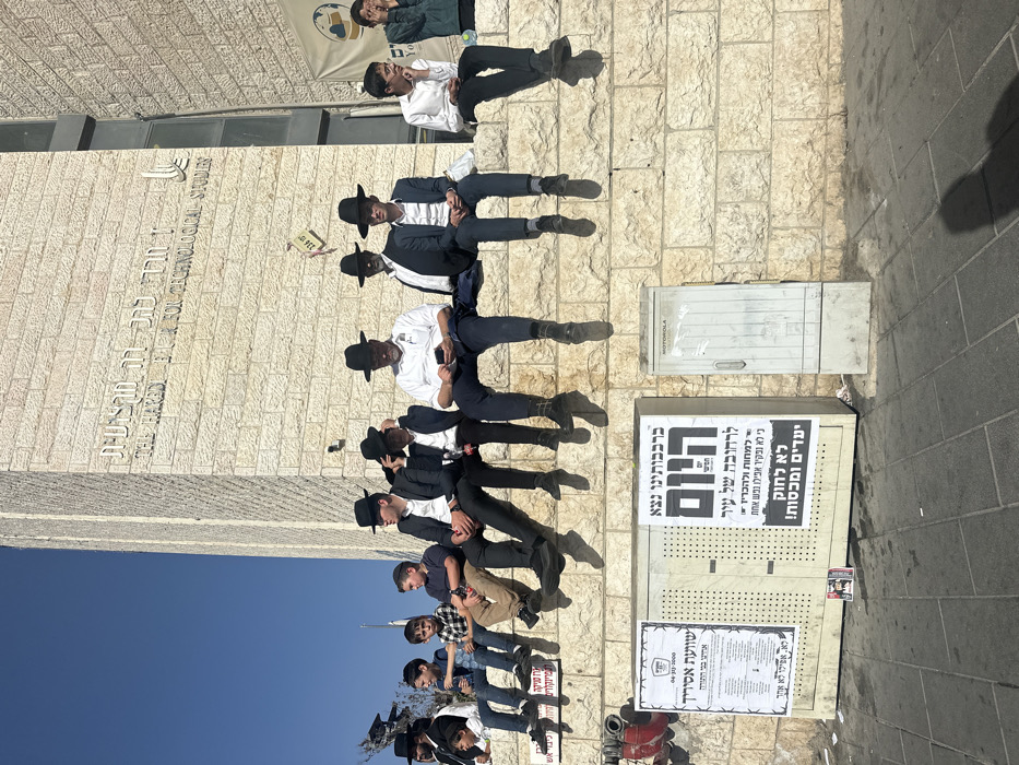 Approximately twelve males, ranging from young children to adults, are seated on a prominent stone ledge at the base of a light-colored stone building under a clear blue sky. The building is identified by an inscription in English and Hebrew as "THE HAREDI B.A. FOR TECHNOLOGICAL STUDIES," situating the scene in Jerusalem, Israel. The seated individuals include adult men in traditional Haredi attire (black hats, white shirts, dark suits) and younger males in more casual clothing such as jeans and t-shirts. Their feet hang freely, casting strong, distinct shadows onto the stone wall below the ledge. Several individuals are focused on objects in their hands; one adult man in a white shirt and black hat is looking at a mobile phone, as is a young male on the far right. Another young male on the far right has his hands covering part of his face. All individuals generally face forward and to the right, appearing to observe an unseen event or activity. Below the ledge, on a grey paved sidewalk, a large, rectangular light-grey utility box displays two posters with Hebrew text. To its right, a smaller, narrow grey utility box marked "MOTOROLA" is visible. On the far left, a red fire hydrant assembly is mounted on the building's wall. The scene is brightly illuminated by direct sunlight, as indicated by the sharp shadows cast by the people and structures.