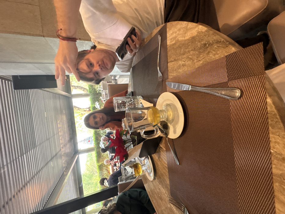 A table with brown placemats, silverware, and glassware occupies the scene. Two people are partially visible: a woman sitting across the table and a man holding a phone above, partially capturing himself in the image. Outside, a blurry view of greenery and other diners suggests a restaurant setting. A decorative floral arrangement is present on the table.