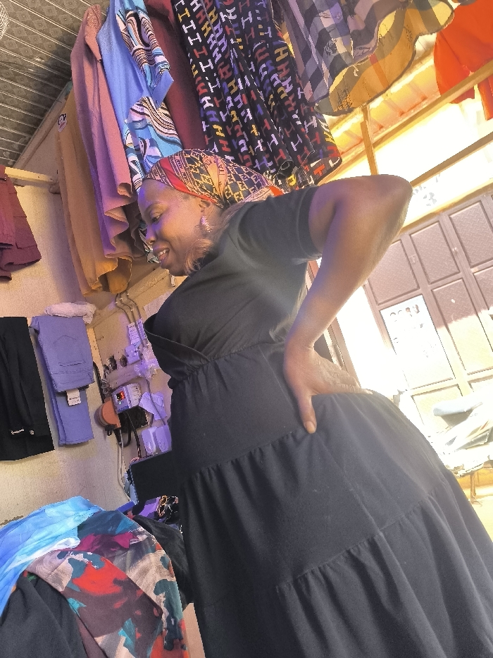 An adult female is depicted standing within a clothing retail stall in Samaru, Nigeria