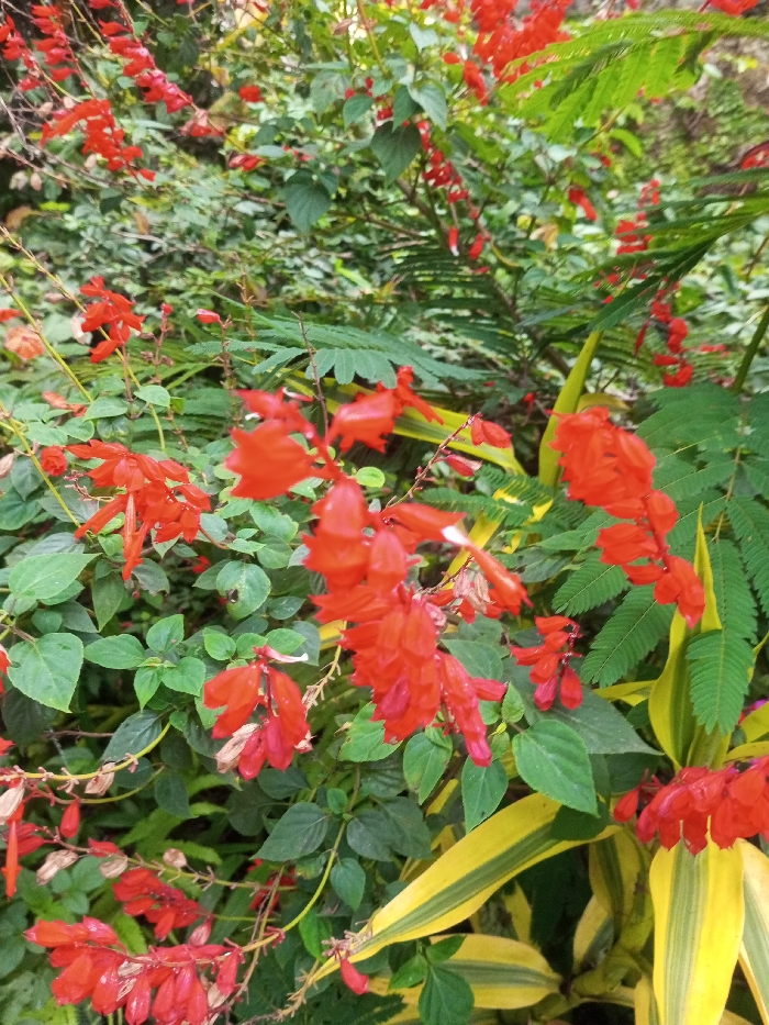 The scene depicts a dense botanical arrangement in Tecuci, Romania. The primary subjects are numerous clusters of bright red, tubular flowers, consistent with *Salvia splendens*, distributed throughout the frame. These flowers are interspersed with various green foliage, including small, ovate leaves, finely pinnate, fern-like leaves, and broad, strap-like leaves exhibiting yellow and green variegation, particularly in the lower right quadrant. The plants are in an outdoor setting, suggesting a garden or natural vegetative area. No individuals or non-botanical objects are present, and no discernible actions or interactions are occurring.