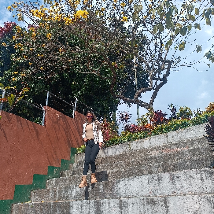 An adult female is captured mid-stride descending a wide, weathered concrete staircase in an outdoor, landscaped environment within San Pedro de Los Altos, Venezuela. She is positioned centrally, her left foot on a lower step and her right foot raised. She wears dark trousers, a light-colored top, a white patterned jacket, and tan ankle boots, complemented by sunglasses. Her hair is wavy and light-colored, and she faces the camera with a faint smile. To the left of the staircase, a reddish-brown retaining wall with a dark green base rises, topped by a silver-colored metal railing. Dense green foliage and a large tree adorned with numerous bright yellow flowers are visible behind this wall and railing. To the right of the staircase and behind the subject, a landscaped bed contains various plants with red, green, and variegated leaves. A distinct tree with a gnarled trunk and sparse leaves extends upward on the right side. The background features dense green trees under a partly cloudy blue sky, indicating daylight conditions.