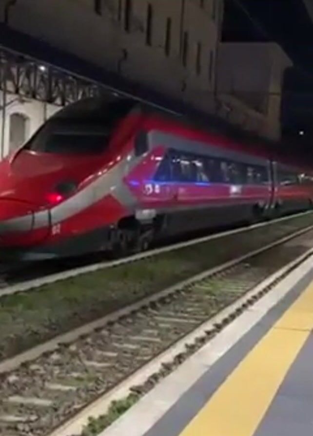 At night, a red and gray train travels along a train track next to a platform with yellow safety markings. The train is long and sleek, with illuminated windows. A woman in a dark coat stands on the platform, looking at her phone as the train passes. The train station is dimly lit by overhead lights. A multi-story building is visible across the tracks.
