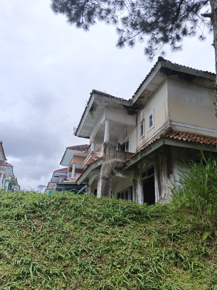 A row of weathered two-story houses with tile roofs and white exterior walls. The buildings show signs of neglect, with visible staining and disrepair. Lush green grass covers a slope in the foreground, obscuring the lower portions of the houses. A cloudy sky dominates the background, and a tree branch with pine needles is visible in the upper right corner.