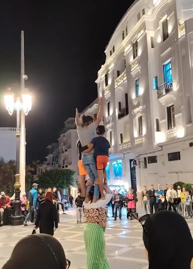 At night in a plaza with a white building as a backdrop, street performers are standing atop one another to create a three-tiered human tower. The base appears to be a person covered with a green and white striped wrap, with the next level a fair-skinned person with orange shorts, and a slightly taller person at the top with jeans. The person at the very top is raising their arms. The plaza is full of spectators. A street lamp is to the left of the group.
