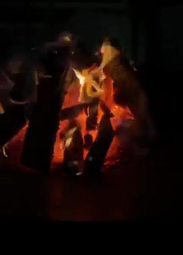 campfire in the dark. There are logs stacked on top of each other, and orange and yellow flames are visible. Voices can be heard in the background.