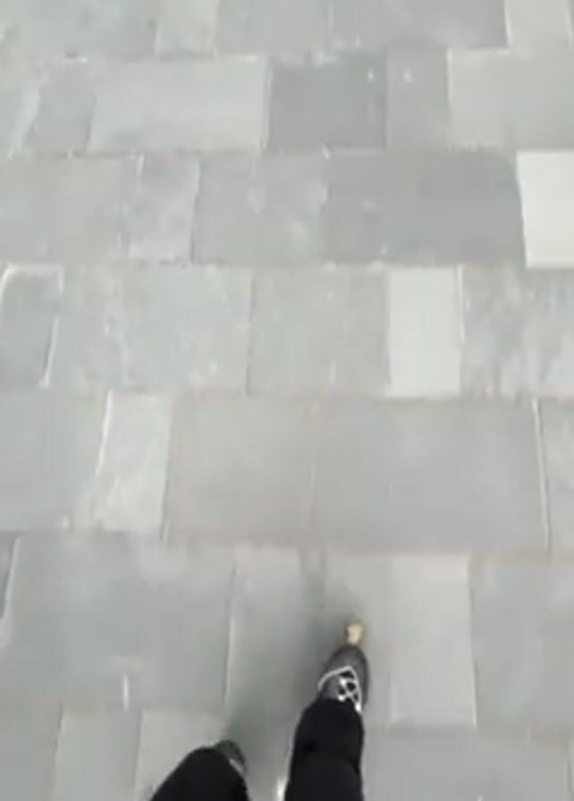 person rollerblading on a gray stone path. The camera perspective is from the person's point of view looking down at their feet in black pants and rollerblades. The path is made of rectangular gray stones. As the person continues, the view shifts, revealing palm trees lining the path and a building with a tower in the distance.