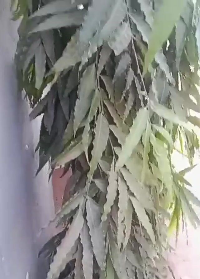 hanging plant with many long, slender, green leaves. The plant appears to be growing close to a wall. The lighting suggests the video was taken outdoors on a sunny day. The camera angle is low, looking up at the plant, and the camera moves slightly throughout the video.