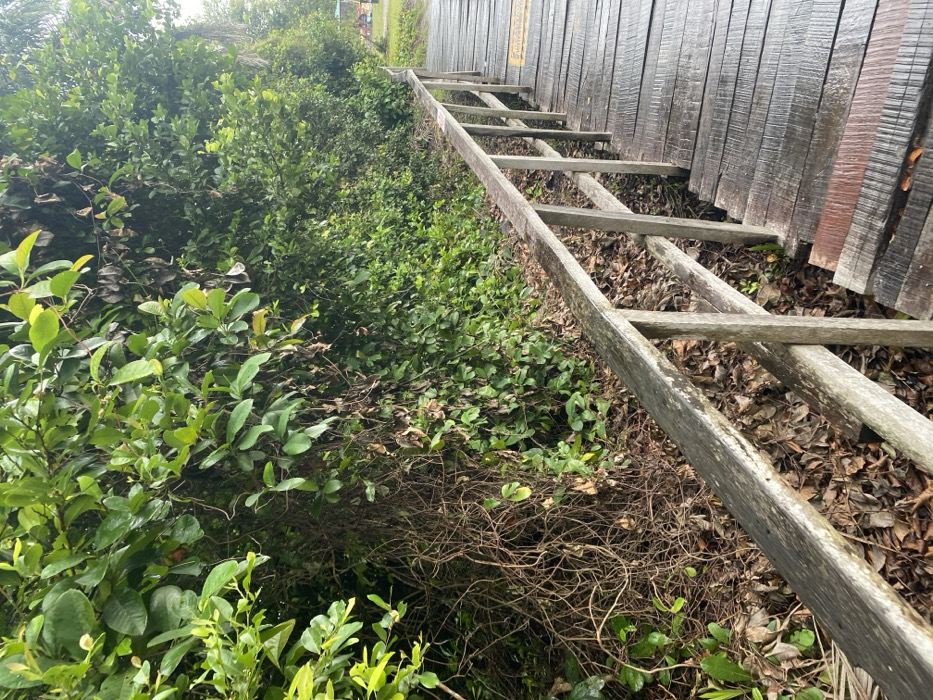 The image depicts a wooden boardwalk or pathway in Ikota, Nigeria, running alongside dense, untamed vegetation. The boardwalk is constructed from aged wooden planks, some exhibiting a reddish-brown discoloration. A weathered wooden handrail, supported by vertical posts, parallels the pathway on the left side of the frame. To the left of the handrail, a narrow strip of ground is visible, covered in fallen brown leaves and dry branches. Beyond this strip, a wall of lush green foliage and tangled vines rises, dominating the background. No individuals, subjects, or actions are present in the frame. The sky is partially visible through the foliage at the upper right, suggesting an overcast or bright ambient light.