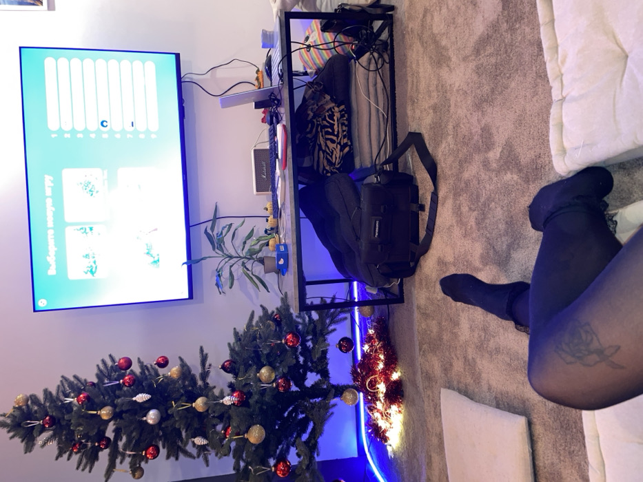 A Christmas tree with red and gold ornaments sits beside a black metal desk. A television displaying a game in Russian hangs on the wall behind the desk. Various items are on the desk, including a laptop, Marshall speaker, and a black camera bag hanging on the side. A person wearing black stockings and boots is seated on a white cushion to the right. The room has gray carpeting and is lit by blue lights.