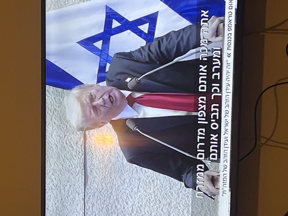 This image is a photograph of a television screen displaying a news broadcast, taken within an indoor environment in Bat Yam, Israel