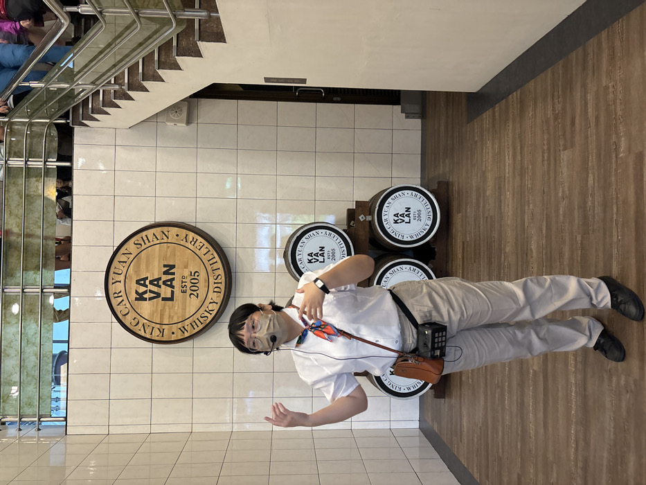 The image displays an indoor scene within the Kavalan Whisky Distillery, located in Yuanshan, Taiwan