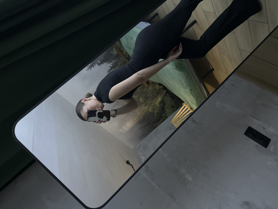 The image displays a reflection of a person taking a mirror selfie in an indoor setting