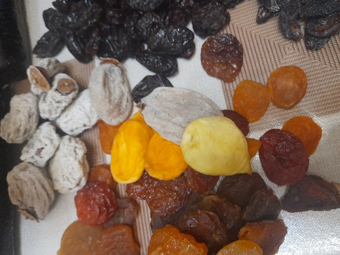 - "The scene depicts a static, close-up, high-angle view of a diverse assortment of dried fruits distributed across a light-colored surface, partially overlaid with a beige or light brown woven mat" by FM-iphKu2, licensed under CC BY 4.0