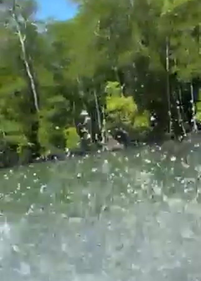 view from a moving boat on a sunny day. The water is choppy, with spray coming up. On the edge of the water, there's a green tree line. The sky is blue.