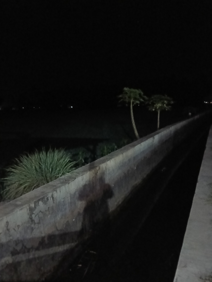 The image depicts an outdoor night scene in Blangkutacoh, Indonesia. A concrete irrigation canal or ditch runs from the lower right foreground diagonally towards the center-left midground. The inner wall of this structure, visible in the foreground, displays textural variations and discoloration. Adjacent to the canal on its left bank, a dense cluster of spiky, green vegetation is present. In the midground, two slender trees with foliage concentrated at their tops, characteristic of palm trees, are silhouetted against a dark, largely featureless night sky. Faint points of light are discernible on the distant horizon. A distinct human shadow, originating from an unseen light source behind the viewer, is cast onto the interior wall of the concrete canal.