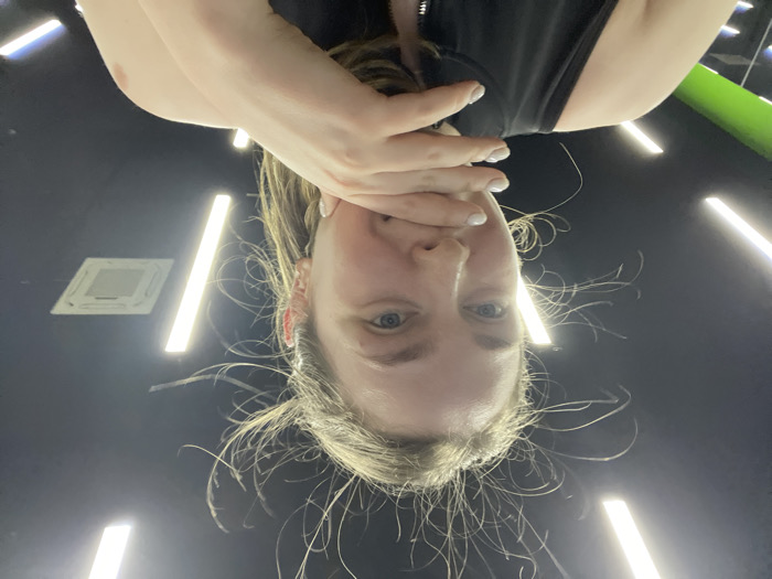 A young adult female is depicted in a medium-close-up, looking directly at the viewer with a slight smile. Her light-colored hair exhibits significant static charge, with numerous individual strands standing upright and curving away from her head. Her left hand, with light-colored nail polish, covers her mouth and chin. She wears a dark, possibly black, athletic top with a visible front zipper. The indoor background features a dark ceiling illuminated by multiple bright, linear light fixtures arranged horizontally. An air vent is visible on the ceiling in the upper right quadrant. A faint green reflection and additional lights are discernible in the lower-left background, suggesting a reflective surface such as a mirror. The specific location within the city of Kommunarka, Russia, is not discernible from the visual evidence.