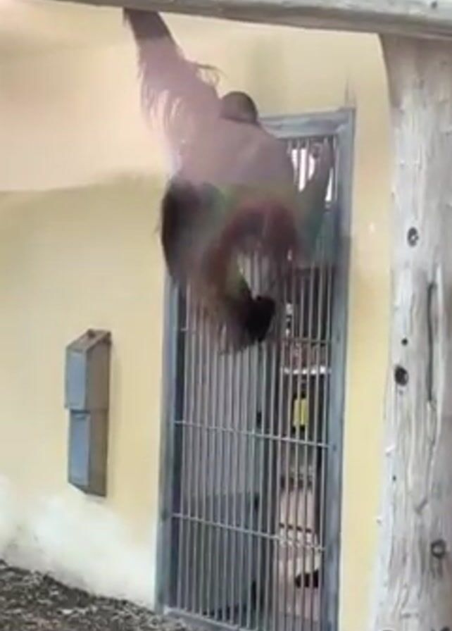 n orangutan hanging by its arms from a wooden beam inside an enclosure, visible through a glass barrier. The orangutan is predominantly brown with long hair. It's hanging in front of a barred metal door or gate. To the left of the gate is a small grey box mounted on a light yellow wall. The floor appears to be covered with dark mulch or wood chips. A partially visible tree-like structure stands to the right of the gate. The scene is brightly lit.