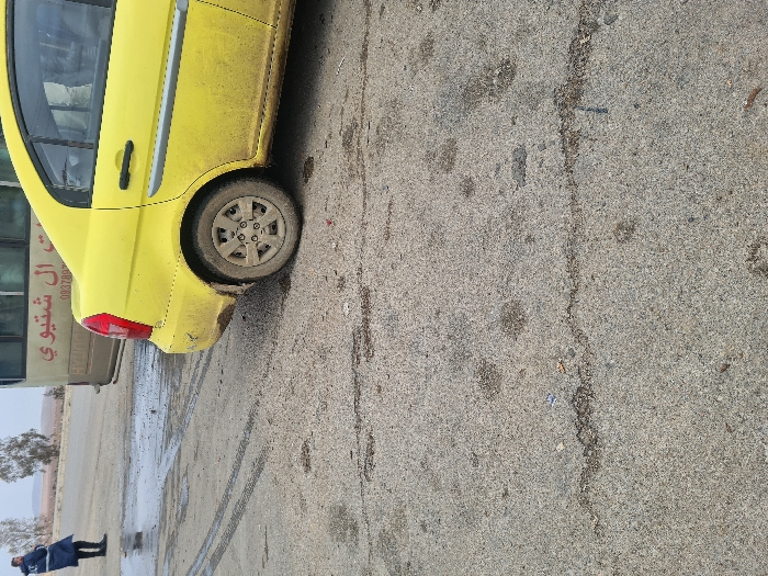 The image depicts an outdoor roadside or paved area in Mankat al-Hatab, Syria, under an overcast sky. In the mid-ground, a yellow four-door sedan is positioned, heavily caked with mud and dirt on its rear wheel, lower body panels, and mudguards. A silver trim strip extends horizontally along the lower portion of its side doors. Partially visible behind the sedan is a light-colored bus, displaying Arabic text "ال شتيوي" and a partial phone number "093789..." on its side. To the left of the vehicles, a single individual, dressed in a dark blue long coat and dark footwear, stands facing left, situated near a prominent dark puddle and discernible tire tracks on the wet asphalt surface. The foreground consists of cracked, dirty asphalt pavement containing multiple dark, wet patches and minor debris. The background reveals sparse, leafless trees on barren ground, leading to low, distant hills.