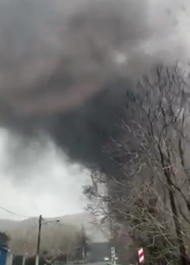 large column of dark smoke rising into the sky next to a road. The camera is moving along the road, presumably in a car. Bare trees line the side of the road, and there are utility poles with wires. In the distance, there are hills or low mountains. The sky is overcast. There is a building on the left side of the road, and cars can be seen in the distance.
