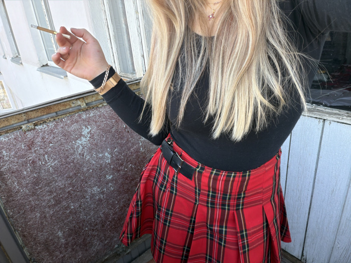 The image displays a partial view of an individual, likely female, positioned on a balcony or at a window in Naberezhnye Chelny, Russia. The subject has long blonde hair and is attired in a black long-sleeved top, a red tartan pleated skirt with black, green, and yellow elements, and a black belt. The left wrist is adorned with two gold-colored bracelets, and a small pink pendant is visible on a thin neck chain. The left hand holds a lit cigarette. The immediate foreground features a weathered, reddish-brown surface with irregular lighter patterns, consistent with a balcony floor. To the left, a multi-pane white wooden window frame provides a glimpse of an exterior view. To the right, light-colored vertical wooden paneling is visible. The environment exhibits signs of age and wear.