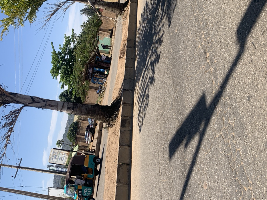 The image portrays a sunlit street scene in New Stadium, Nigeria. A paved road occupies the foreground and mid-ground, featuring a concrete curb and a sandy median strip. Long, distinct shadows from unseen objects and prominent palm trees (one in the immediate foreground, another on the right mid-ground) extend across the asphalt. On the left side of the road, a teal, yellow, and brown motorized tricycle, marked with "PTA 219," is positioned with a driver visible inside. Further down the road on the right, a blue roadside kiosk, partially obscured by a tree, is visible, with at least two individuals standing near it. A motorcycle is parked adjacent to this kiosk. In the background, a light brown concrete wall runs parallel to the road, behind which at least two light-colored sedans are parked. Beyond the wall, a dense arrangement of green trees and foliage is present. A tall, white rectangular sign on the left side of the road prominently displays "SAINT GIDEON MATH ACADEMY HIGH SCHOOL" along with other text. Multiple utility poles with overhead wires are visible against a clear blue sky, with distant hills discernible on the horizon.