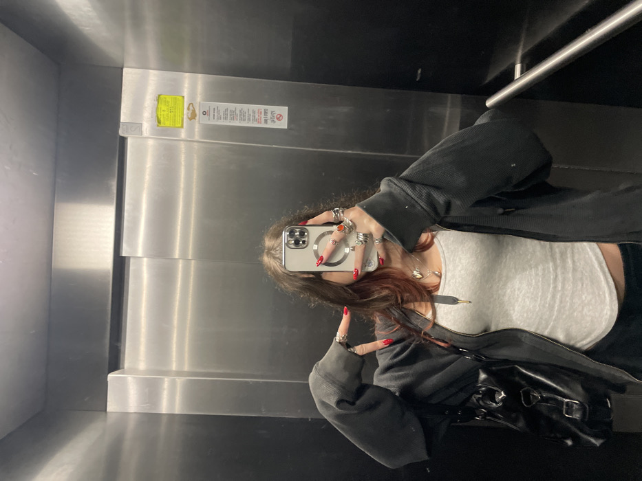 A person stands in an elevator, taking a selfie. The elevator's interior is stainless steel, with notices affixed to the back wall. The person holds a phone adorned with rings on their fingers. They wear a grey tank top under a black, zip-up jacket, accessorized with a necklace and a black purse. The person makes a peace sign with their fingers.