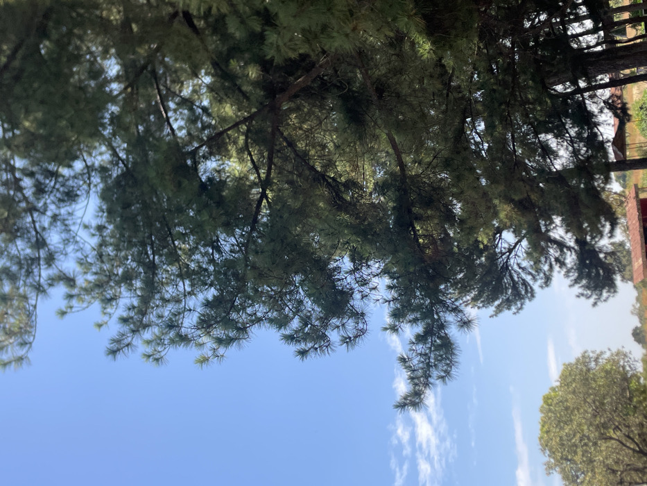 The image captures an outdoor scene in Jos, Nigeria, under a clear blue sky with minimal scattered white clouds visible in the upper and lower left quadrants. The right and central portions of the frame are dominated by a dense canopy of mature pine trees with dark green needles and visible branches. To the lower left, a large, rounded, light-green deciduous tree is partially visible. In the lower right background, partially obscured by the pine trees, two small, rustic structures with reddish corrugated metal roofs are present. The ground beneath the trees appears to be an open, vegetated area. No human subjects or discernible activities are depicted.