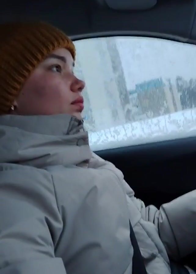 woman driving a car in snowy conditions. The woman has light skin and is wearing a yellow knit hat and a light gray winter jacket with the hood up. She is wearing a seatbelt and is looking out the windshield, presumably focusing on the road. The window next to her is covered in snow. Through the snow-covered window, buildings and trees can be seen, indicating she is driving through a town or city. The video is taken from inside the car.