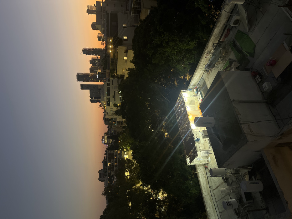 An elevated, static wide-angle shot captures a Tel Aviv urban landscape at sunset, transitioning into dusk. The sky transitions from a deep indigo at the zenith to vibrant orange, yellow, and pink hues at the horizon line. In the immediate foreground, a series of flat concrete rooftops are visible. On a prominent lower rooftop, a temporary, rectangular structure, likely a sukkah, is erected. It features translucent, light-colored fabric walls and a slatted or mesh roof, with interior artificial lighting emitting visible rays. Adjacent to this structure, a white cylindrical water heater/tank stands prominently. Further on the same rooftop, a table with chairs, some draped with green coverings, and miscellaneous objects are situated. Other rooftops display additional white cylindrical water heaters/tanks and air conditioning units. The midground is dominated by a dense canopy of dark green trees, obscuring the lower portions of urban buildings. Scattered artificial lights from various windows and possibly streetlights are visible amongst the foliage and partially obscured multi-story buildings. The background reveals the distant Tel Aviv city skyline, characterized by a cluster of modern high-rise buildings, several of which appear to be under construction with visible structural elements or scaffolding. Numerous windows within these towers are illuminated. No individuals are discernible anywhere in the scene. The overall environment is an urban setting, observed during the twilight hours.