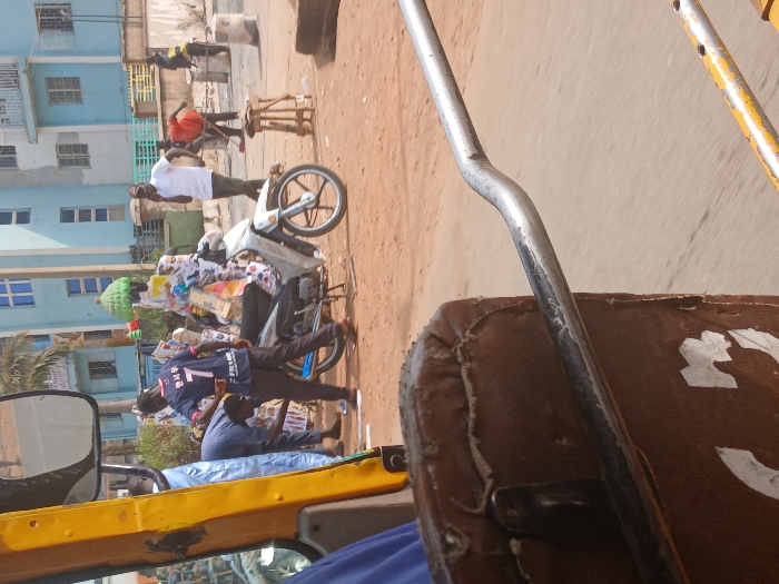 The image depicts an outdoor street scene in Rafin Par, Nigeria, captured from the interior of a moving tricycle (Keke Napep)