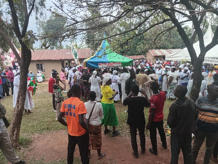 The image portrays an outdoor community gathering in Manda-Shivanga ward, Kenya, under an overcast sky. A diverse crowd, estimated at over 100 individuals, is assembled on a grassy area interspersed with reddish-brown dirt paths. Numerous trees with foliage are present, with a prominent tree trunk and branches in the foreground on the left. In the background, several single-story buildings with light-brown walls and reddish-brown corrugated iron roofs are visible. Multiple tents are erected: a central, multi-colored (blue, green, yellow) patterned gazebo-style tent, a green tent on the left with partial text visible, and a white tent on the right displaying partial text including "MUSLIM W..." and "TWO SACCO...". A large green and white banner or flag is visible behind the central tent. A significant portion of the attendees, particularly women, are dressed in white head coverings and white dresses, indicating a potential religious or ceremonial event. Other individuals wear various casual attire; notable figures include a person in a light-brown textured garment in the center and another in white holding red and green decorative items on the far left. Several individuals in the immediate foreground, including a man wearing an orange t-shirt with "SIMBA WA SHIVA" printed on the back, are observing the central activities. The collective action is one of gathering and observation, with no specific intense interactions discernible.