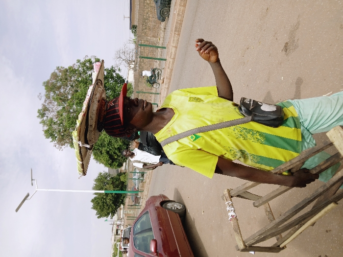 An urban street scene in Masvingo, Zimbabwe, observed during daylight. In the foreground, a young male walks towards the right, balancing a white-padded rectangular tray secured by a strap on his red and black striped baseball cap, which is worn backward. He wears a yellow and green striped t-shirt, light blue-green trousers, and a dark messenger bag with a white circular logo slung across his chest. His left hand carries a wooden, ladder-like frame, while his right hand holds a small, light-colored object. His expression is neutral, and he looks slightly to the right of the frame. In the mid-ground, a male in a white shirt and dark backpack walks behind the primary subject. A tall white street light pole with two solar-powered fixtures, featuring a green base, stands prominently. To the left, a dark red sedan is partially visible. The paved road is bordered by a light brown curb and a green metal fence on the right, beyond which a person on a motorcycle is visible. Green trees and distant structures populate the background under a light sky.